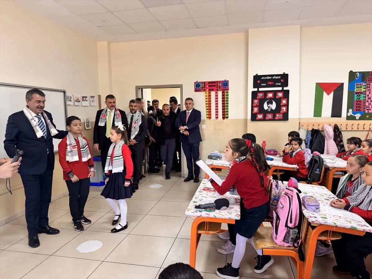 Milli Eğitim Bakanlığınca Türkiye’deki tüm okullarda bugün başlatılan “Filistin Farkındalık Etkinlikleri” kapsamında Ömer Duygun İlkokulu’na gelen Tekin’i, öğrenci ve öğretmeler Filistin atkıları ile karşıladı.