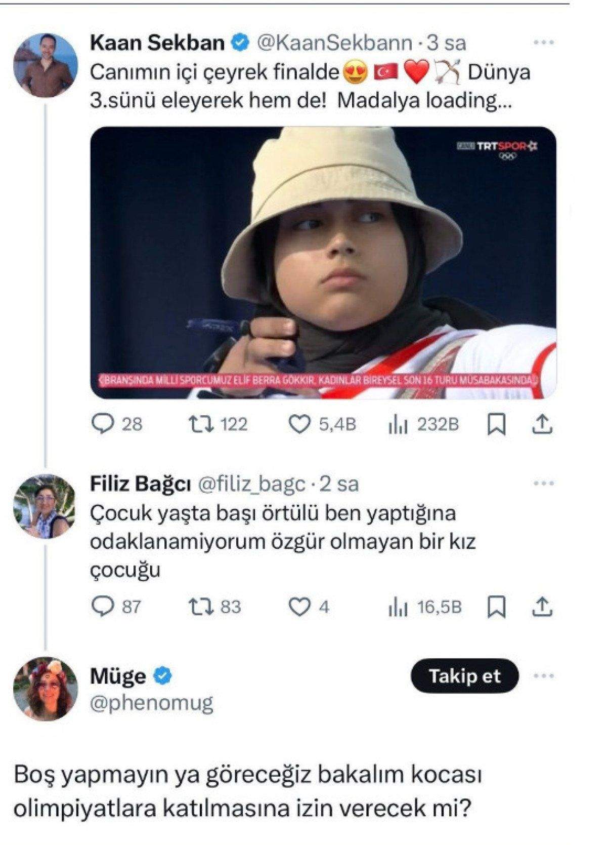 Okçuluk kadınlar klasik yay kategorisinde yarışan milli sporcumuz Elif Berra Gökkır'ın Japon rakibini geriden gelerek yenmesinin ardından sosyal medyada bazı şahıslar çirkin ifadeler kullandı. Gökkır'ı inancı nedeniyle hedef alanların paylaşımları tepki çekti.