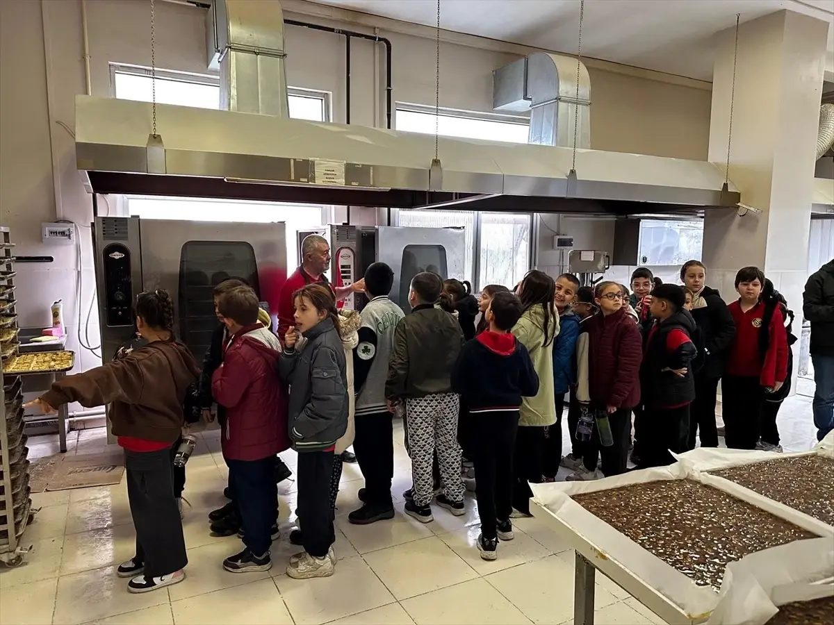Müdürlükten yapılan açıklamaya göre, Şükrüpaşa İlkokulu öğrencileri öğretmenleri eşliğinde kurabiye ve bademezmesi gibi ürünlerin üretim aşamaları gördü.