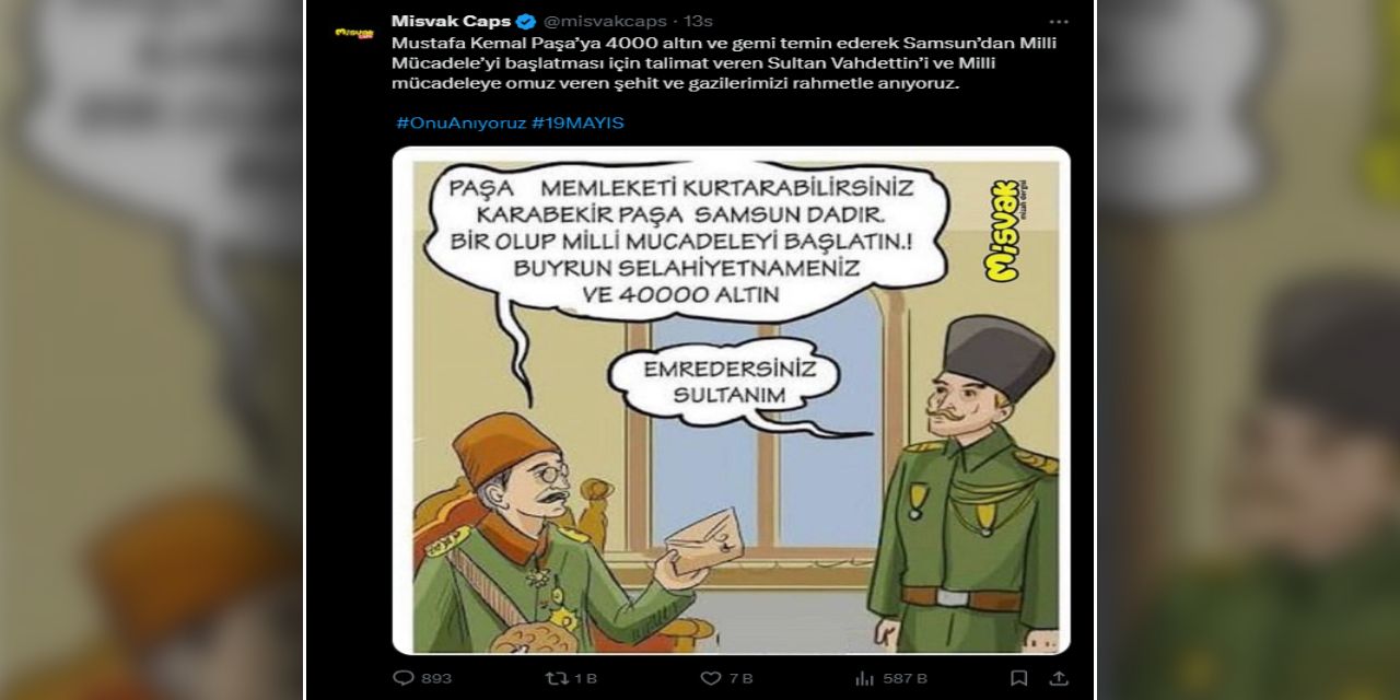 “Mustafa Kemal Paşa’ya 4000 altın ve gemi temin ederek Samsun’dan Milli Mücadele’yi başlatması için talimat veren Sultan Vahdettin’i ve Milli mücadeleye omuz veren şehit ve gazilerimizi rahmetle anıyoruz.”