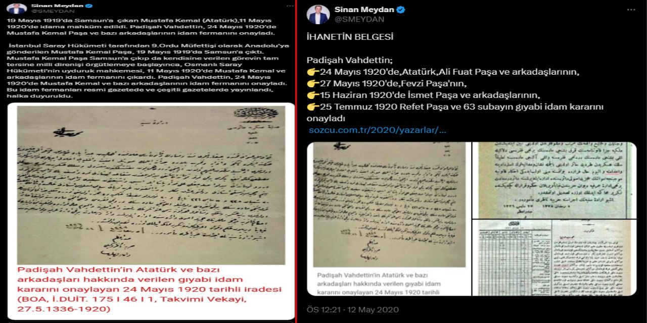 Padişah Vahdettin, 24 Mayıs 1920’de Mustafa Kemal ve bazı arkadaşlarının idam fermanını onayladı. Bu idam fermanları resmi gazetede ve çeşitli gazetelerde yayınlandı, halka duyuruldu.”