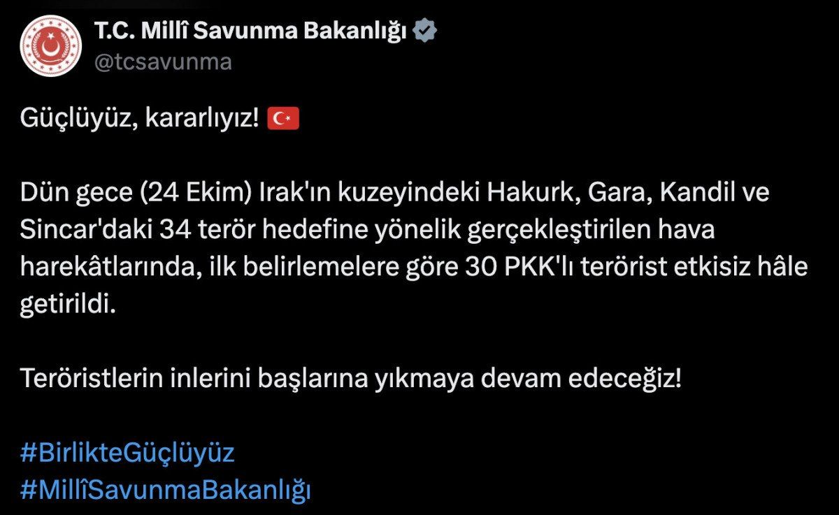Dün gece (24 Ekim) Irak’ın kuzeyindeki Hakurk, Gara, Kandil ve Sincar’daki 34 terör hedefine yönelik gerçekleştirilen hava harekâtlarında, ilk belirlemelere göre 30 PKK’lı terörist etkisiz hâle getirildi.