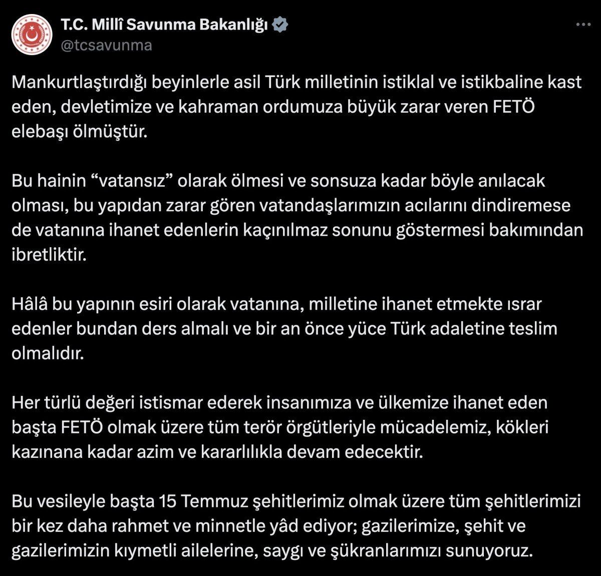 Bu hainin “vatansız” olarak ölmesi ve sonsuza kadar böyle anılacak olması, bu yapıdan zarar gören vatandaşlarımızın acılarını dindiremese de vatanına ihanet edenlerin kaçınılmaz sonunu göstermesi bakımından ibretliktir.