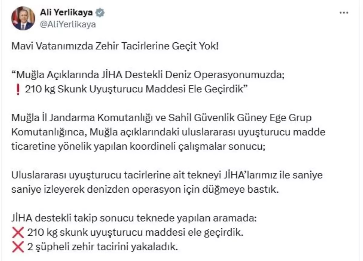 İçişleri Bakanı Ali Yerlikaya, jandarma ve Sahil Güvenlik tarafından gerçekleştirilen deniz operasyonunu sosyal medya hesabından paylaştı. Buna göre; Muğla açıklarındaki uluslararası uyuşturucu madde ticaretine yönelik yapılan koordineli çalışmalar sonucu, insansız hava aracı ile tespit edilen şüpheli tekneye operasyon düzenlendi. Yapılan aramada, 210 kilogram skunk cinsi uyuşturucu madde ele geçirildi, 2 şüpheli yakalandı.