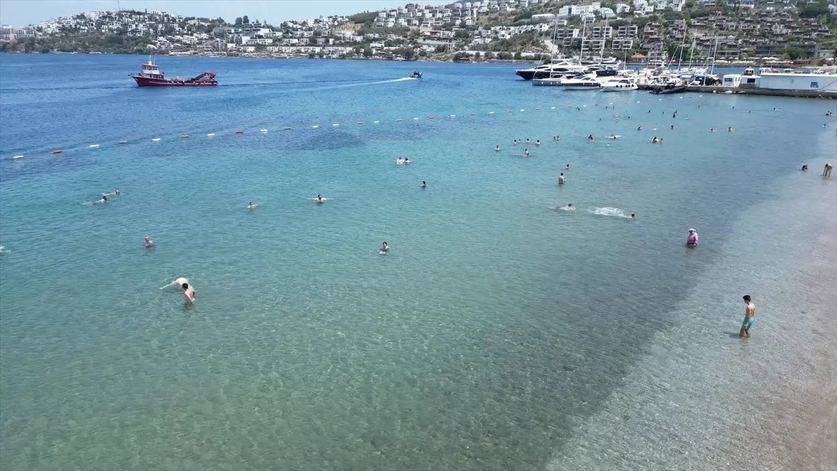 Bodrum ilçesinde yerli ve yabancı turistlerin akın ettiği yarımadanın kuzeyinde yer alan Gündoğan sahilinde sıcak havayı fırsat bilen tatilciler, denize girip güneşlendi.