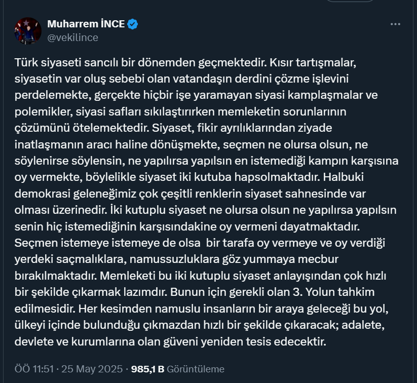 19 mart operasyonlarından sonra meydanlara çıkıp İmamoğlu’na destek veren, öncesinde de sık sık İmamoğlu ile görüşen, CHP’ye döneceği konuşulan Muharrem İnce, “Memleketi bu iki kutuplu siyaset anlayışından çok hızlı bir şekilde çıkarmak lazımdır. Bunun için gerekli olan üçüncü yolun tahkim edilmesidir” dedi.