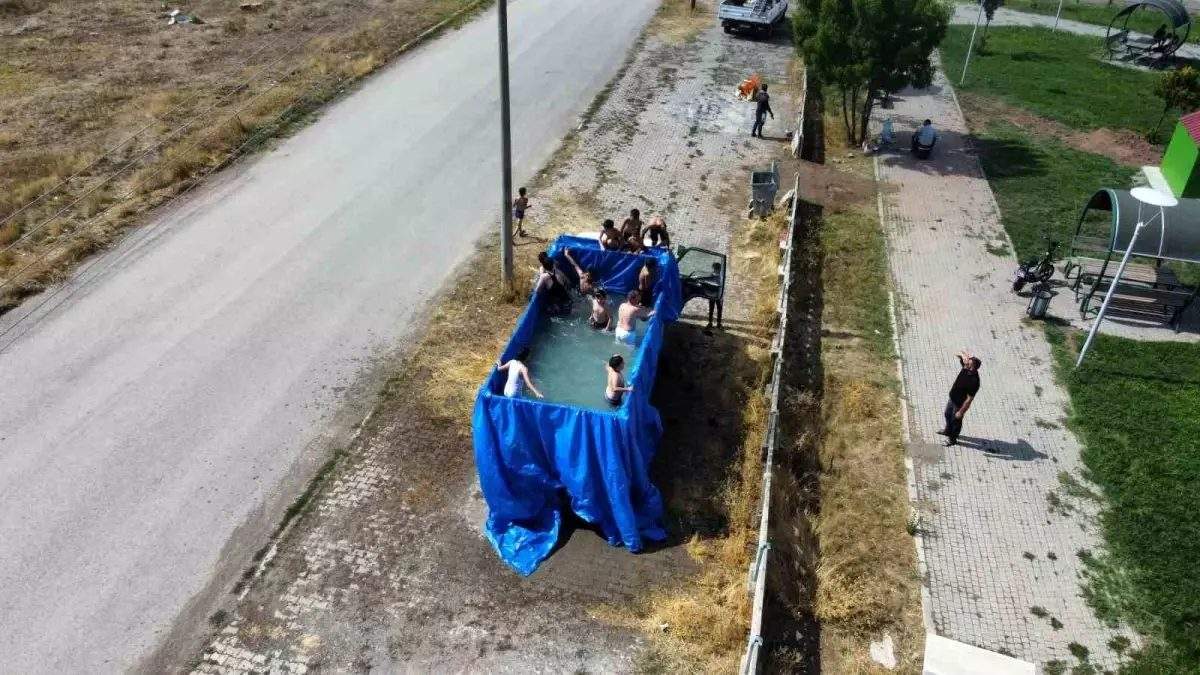 Sivas’ın Şarkışla ilçesinde bir muhtar kamyonun kasasını havuza dönüştürerek çocukların yüzünde tebessüm oluşturdu.