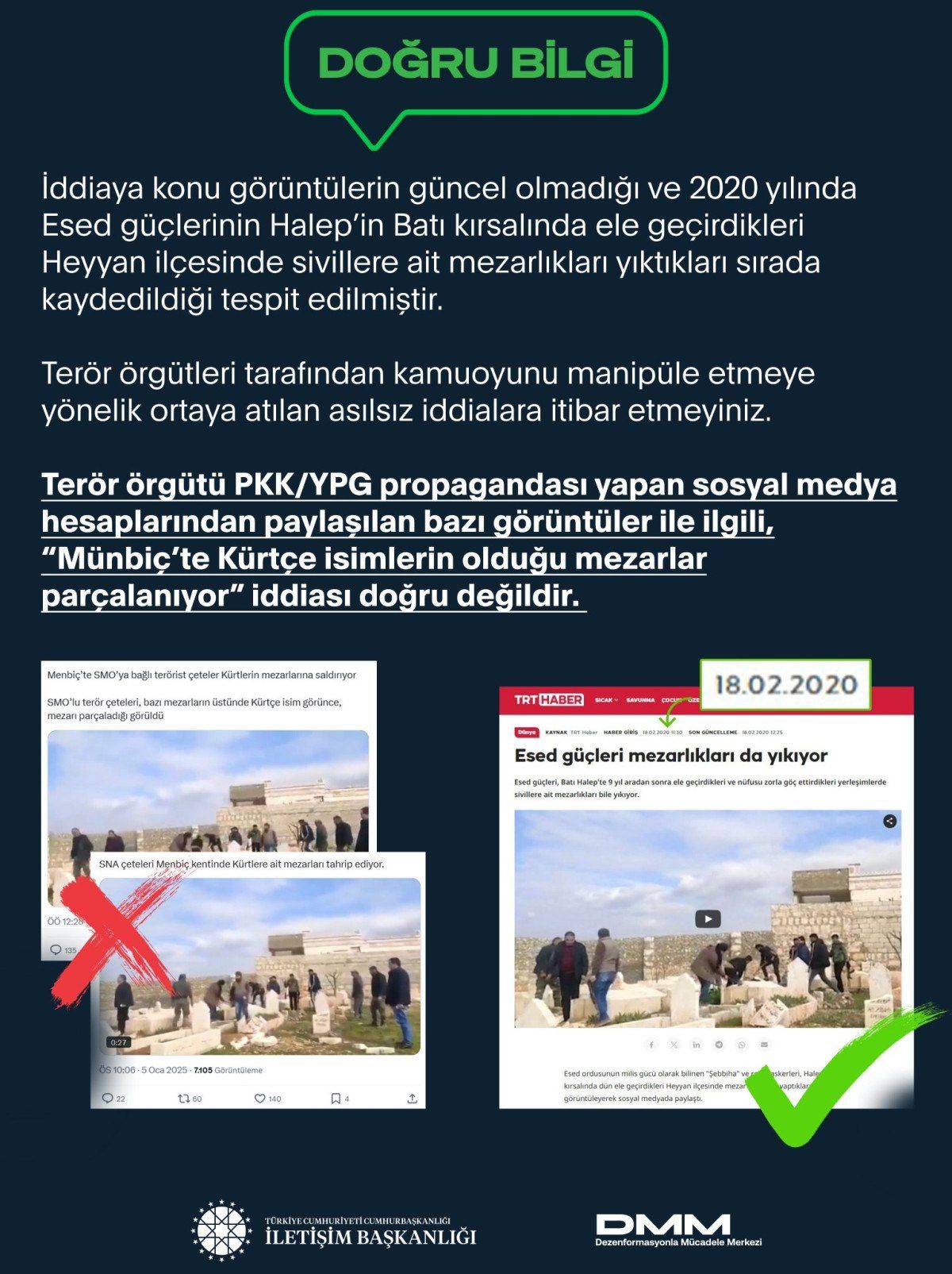 Açıklamada, “Terör örgütü PKK/YPG propagandası yapan sosyal medya hesaplarından paylaşılan bazı görüntüler ile ilgili, “Münbiç’te Kürtçe isimlerin olduğu mezarlar parçalanıyor” haberde asılsız iddiaların ortaya atıldığı bildirildi.