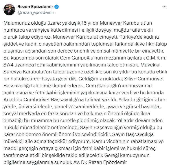 Epözdemir açıklamasında şunları kaydetti: “Malumunuz olduğu üzere; yaklaşık 15 yıldır Münevver Karabulut’un hunharca ve vahşice katledilmesi ile ilgili dosyayı mağdur aile vekili olarak takip ediyoruz. Münevver Karabulut cinayeti, Türkiye’de kadına şiddet ve kadın cinayetleri bakımından toplumsal farkındalık ve fikri takip oluşması açısından son derece önemli ve emsal mahiyette bir cinayettir. Bu kapsamda son olarak Cem Garipoğlu’nun mezarının açılarak C.M.K m. 87/4 uyarınca fethi kabir işleminin yapılmasını talep etmiştik.
