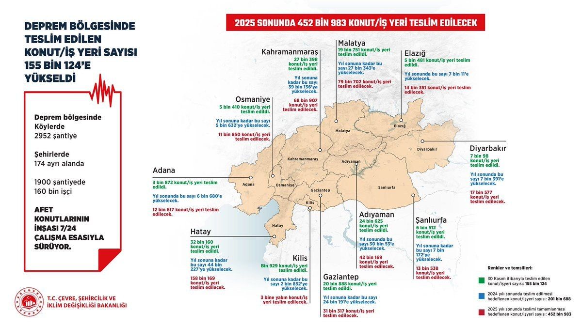 Deprem bölgesindeki köylerde 2 bin 952, şehirlerdeki 174 ayrı alanda bulunan toplam 1900 şantiyede, 160 bin işçi afet konutlarının inşası için aralıksız çalışıyor. Deprem bölgesindeki 11 ilde 2025 yılı sonunda 416 bin 960’ı konut, 36 bin 23’ü ticari ünite olmak üzere toplam 452 bin 983 konut ve iş yerinin teslimatının tamamlanması hedefleniyor.