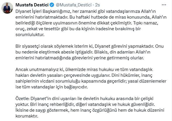 Destici, Diyanet’e yöneltilen eleştirileri “abesle iştigal” olarak nitelendirerek, “Din adamları Allah’ın emirlerini hatırlatmadığında görevlerini yapmamış olurlar. Ancak unutulmamalıdır ki, miras hukuku ve vatandaşlık hakları devletin yasaları çerçevesinde uygulanır. Dini hükümler inanç sahiplerinin vicdani sorumluluğu kapsamındadır; yasal düzenlemeler ise tüm vatandaşlar için bağlayıcıdır” ifadelerini kullandı.