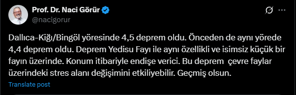 Görür, daha önce yaptığı birçok açıklamada bölgeye dikkat çekerek uyarılarda bulunmuştu. Sosyal medya hesabından yaptığı paylaşımda, “Dallıca-Kiğı/Bingöl yöresinde 4,5 deprem oldu. Önceden de aynı yörede 4,4 deprem oldu. Deprem Yedisu Fayı ile aynı özellikli ve isimsiz küçük bir fayın üzerinde.” ifadelerini kullanan Görür, “Konum itibariyle endişe verici. Bu deprem çevre faylar üzerindeki stres alanı değişimini etkileyebilir. Geçmiş olsun.” sözlerini sarf etti.