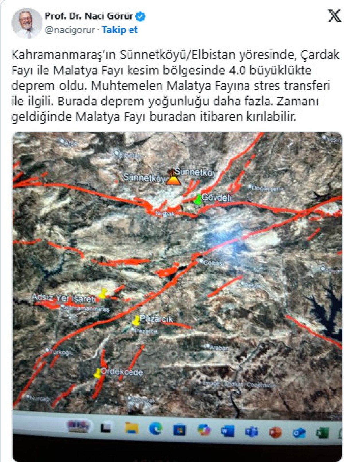 “Kahramanmaraş’ın Sünnetköyü/Elbistan yöresinde, Çardak Fayı ile Malatya Fayı kesim bölgesinde 4.0 büyüklüğünde bir deprem oldu. Bu deprem, muhtemelen Malatya Fayına stres transferiyle ilgili bir durum. Burada deprem yoğunluğu daha fazla. Zamanı geldiğinde, Malatya Fayı buradan itibaren kırılabilir.”