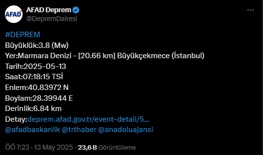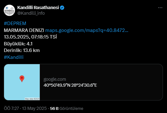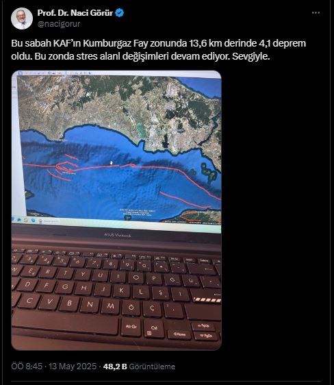 “Bu sabah KAF’ın Kumburgaz Fay zonunda 13,6 km derinde 4,1 deprem oldu. Bu zonda stres alanl değişimleri devam ediyor. Sevgiyle.”