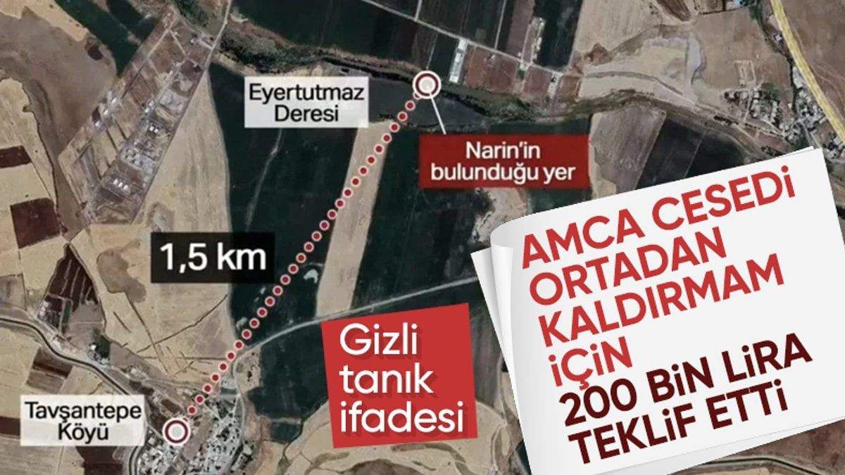 Sabah’tan Halit Turan’ın aktardığı bilgilere göre; gözaltına alınan zanlı sorgusunda, Narin’in amcasının cesedi gömmesi için 200 bin lira teklif ettiğini söyledi.