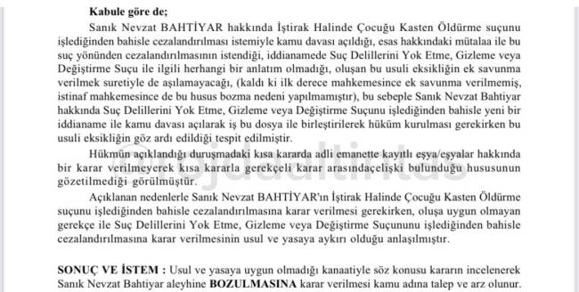 Savcılık, Nevzat Bahtiyar hakkında “İştirak halinde çocuğu kasten öldürme” suçundan kamu davası açılmış olmasına rağmen, mahkemenin iddianamede yer alamayan “suç delillerini yok etme, gizleme veya değiştirme” suçundan hüküm verdiğini belitti.
