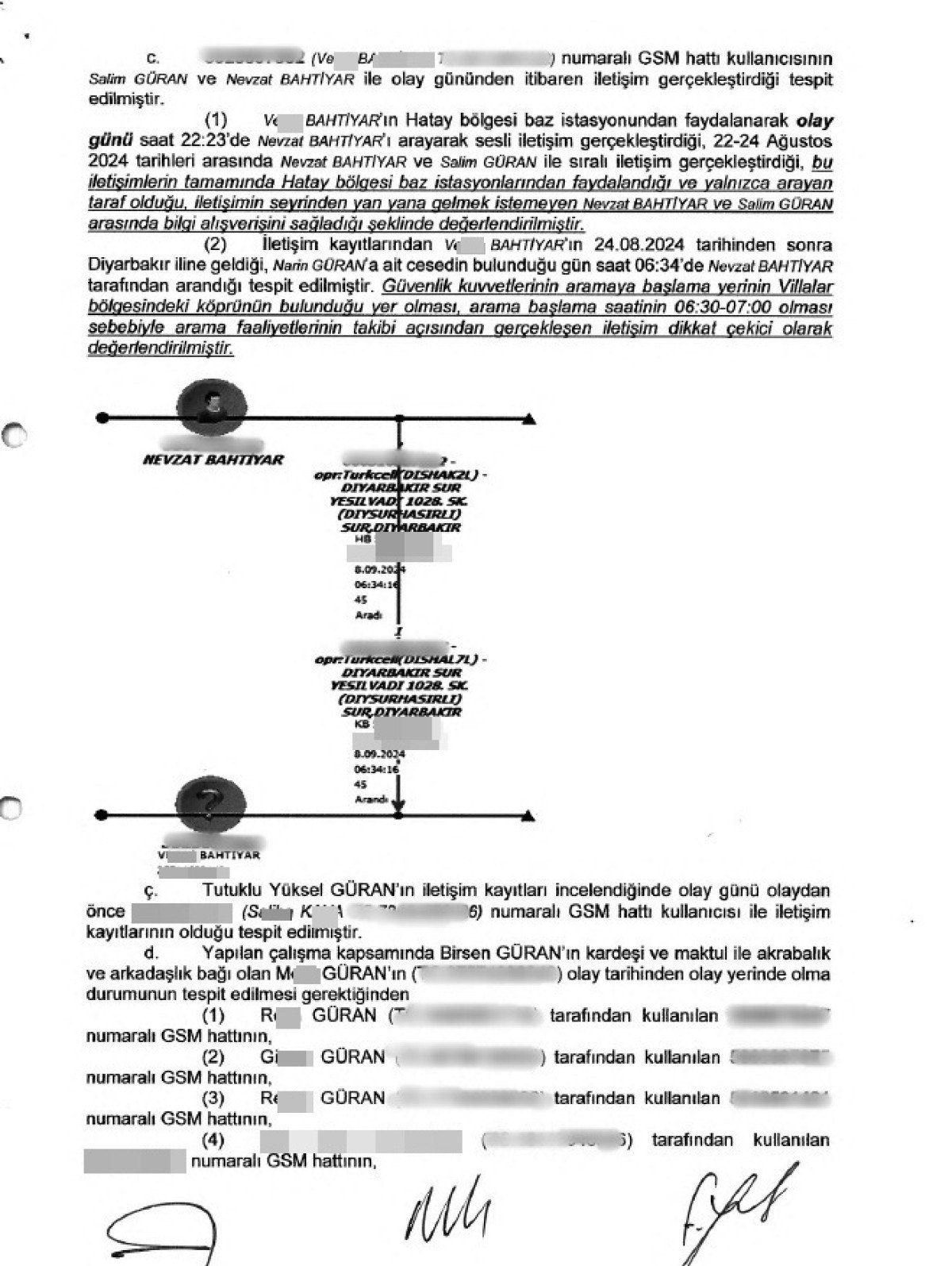 V.B.’nin Hatay bölgesi baz istasyonundan faydalanarak Narin’in kaybolduğu gün saat 22.23’te Nevzat Bahtiyar’ı arayarak sesli iletişim gerçekleştirdiği, 22-24 Ağustos arasında Nevzat Bahtiyar ve Salim Güran ile sıralı iletişim gerçekleştirdiği, bu iletişimlerin tamamında Hatay bölgesi baz istasyonlarından faydalandığı ve yalnızca arayan taraf olduğu, iletişimin seyrinden yan yana gelmek istemeyen Nevzat Bahtiyar ile Salim Güran arasında bilgi alışverişi sağladığı şeklinde değerlendirme yer aldı.