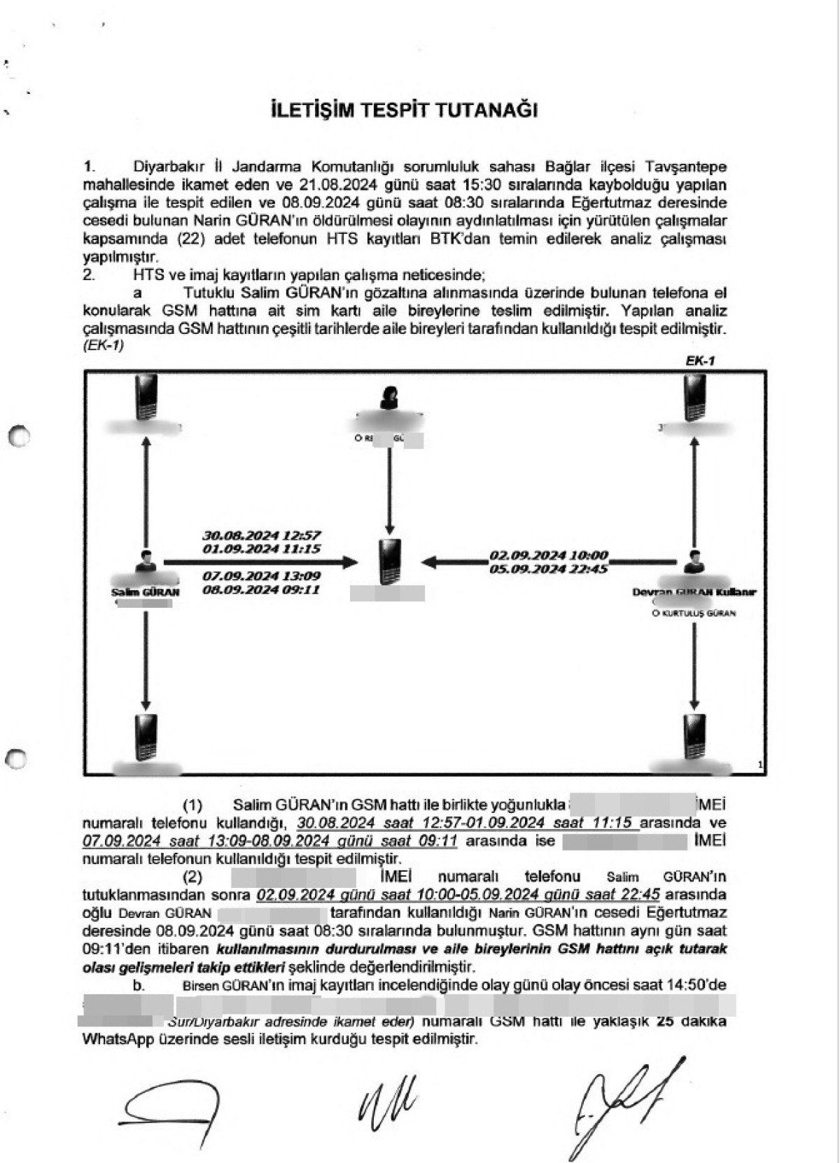 Hazırlanan İletişim Tespit Tutanağı’nda tutuklu Salim Güran’ın gözaltına alındıktan sonra üzerinde bulunan telefona el konularak, GSM hattına ait sim kartının aile bireylerine teslim edildiği, yapılan analiz çalışmasında GSM hattının çeşitli tarihlerde aile bireyleri tarafından kullanıldığı, 8 Eylül’de saat 08.30’da Narin’in cansız bedeninin bulunmasından sonra saat 09.11’den itibaren kullanılmasının durdurulduğu ve aile bireylerinin GSM hattını açık tuttukları belirtilerek, olası gelişmeleri takip ettiklerinin değerlendirildiği ifadesi yer aldı.