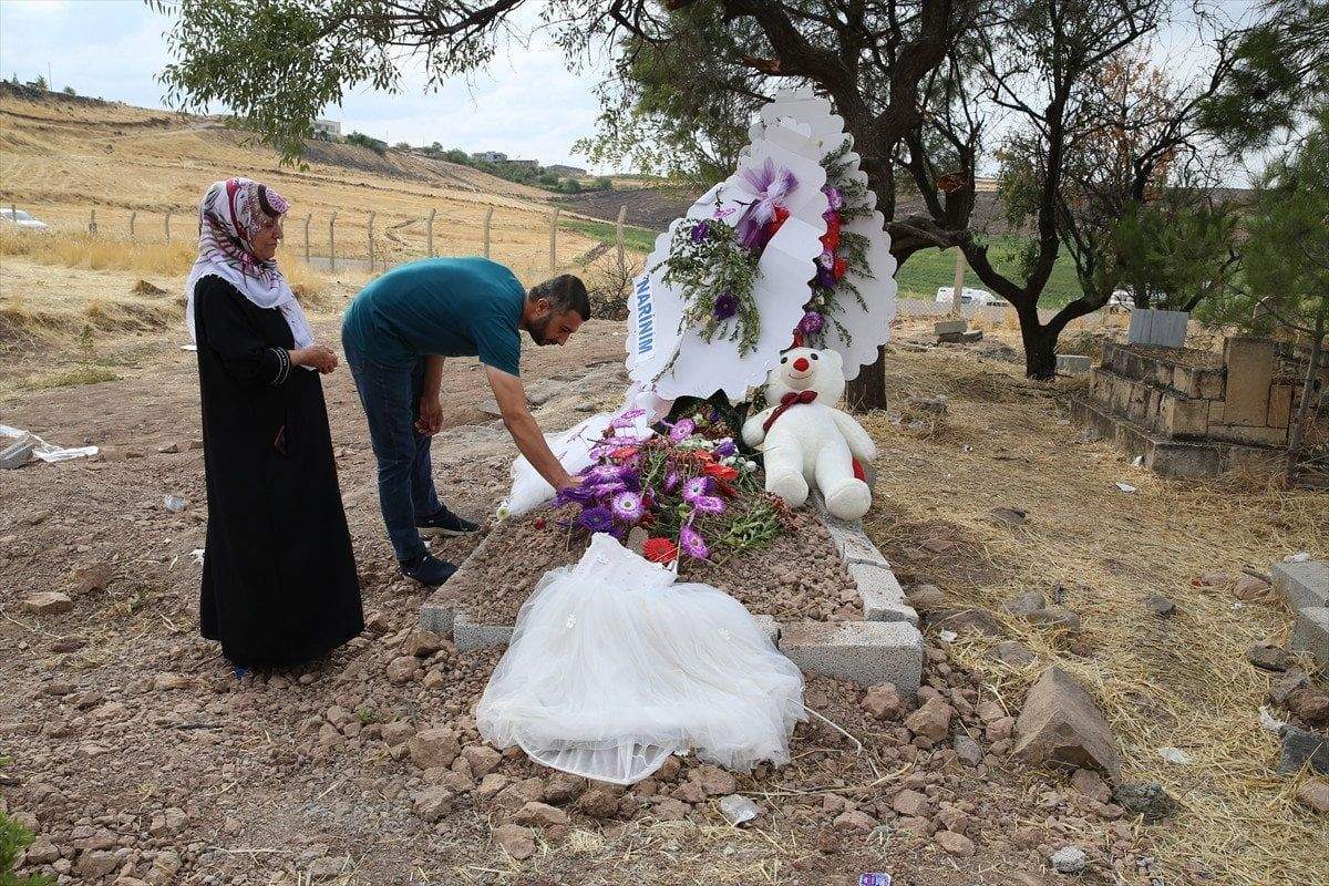 Narin’in Tavşantepe köyündeki mezara gelen ve Narin’e üzülenler, mezarı başına gelerek küçük kız için dua ediyor ve gelinlik getiriyor. Gelinlik getirenler mezarın başına bırakmaya başladı ve Narin’in mezarı gelinlikle kaplandı.