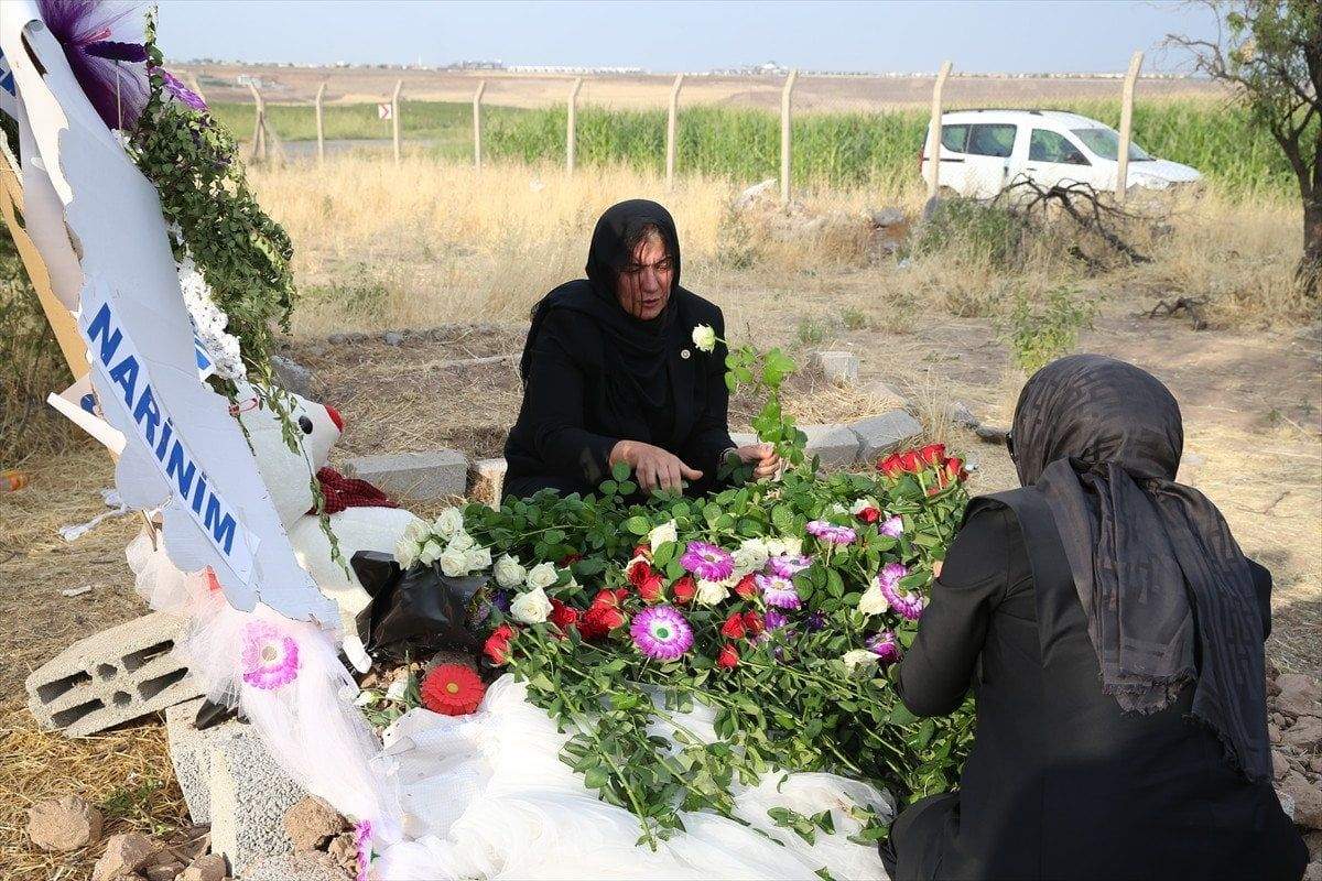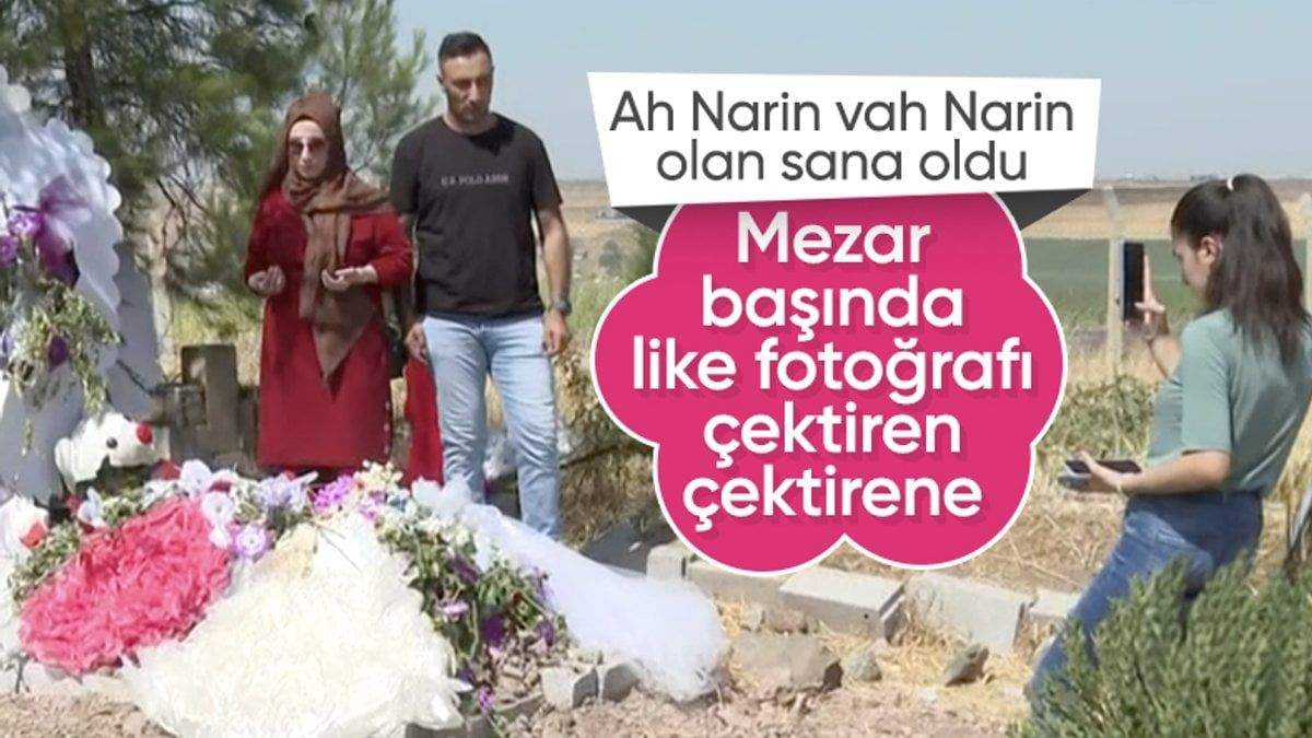 Narin’in mezarı başına gelenlerin bazıları gelinliklik bırakırken, bazıları da fotoğraf çektiriyor. Küçük kızın mezarı başında fotoğraf çektirenlere tepki yağıyor. Sosyal medyada tepki gösterenler, işin şova döküldüğünü söyledi.