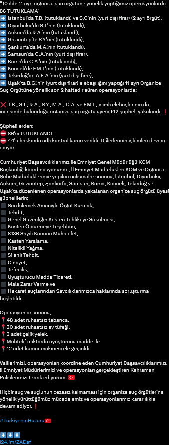 T.B., Ş.T., R.A., S.Y., M.A., C.A. ve F.M.T., isimli elebaşlarının da içerisinde bulunduğu organize suç örgütü üyesi 142 şüpheli yakalandı.❗️