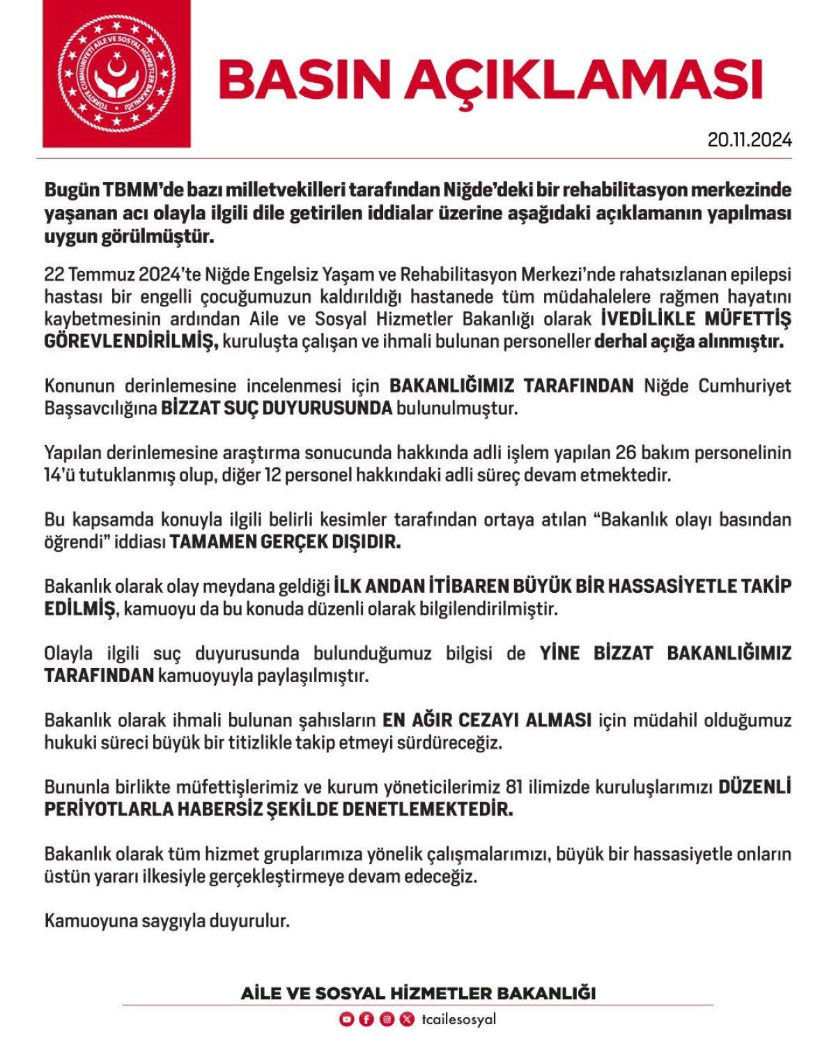 Niğde Engelsiz Yaşam ve Rehabilitasyon Merkezi’nde 22 Temmuz 2024’te rahatsızlanan epilepsi hastası engelli çocuğun kaldırıldığı hastanede tüm müdahalelere rağmen hayatını kaybettiği hatırlatılan açıklamada, Aile ve Sosyal Hizmetler Bakanlığının olayla ilgili hızla müfettiş görevlendirdiği, kuruluşta çalışan ve ihmali bulunan personelin ise derhal açığa alındığı kaydedildi.