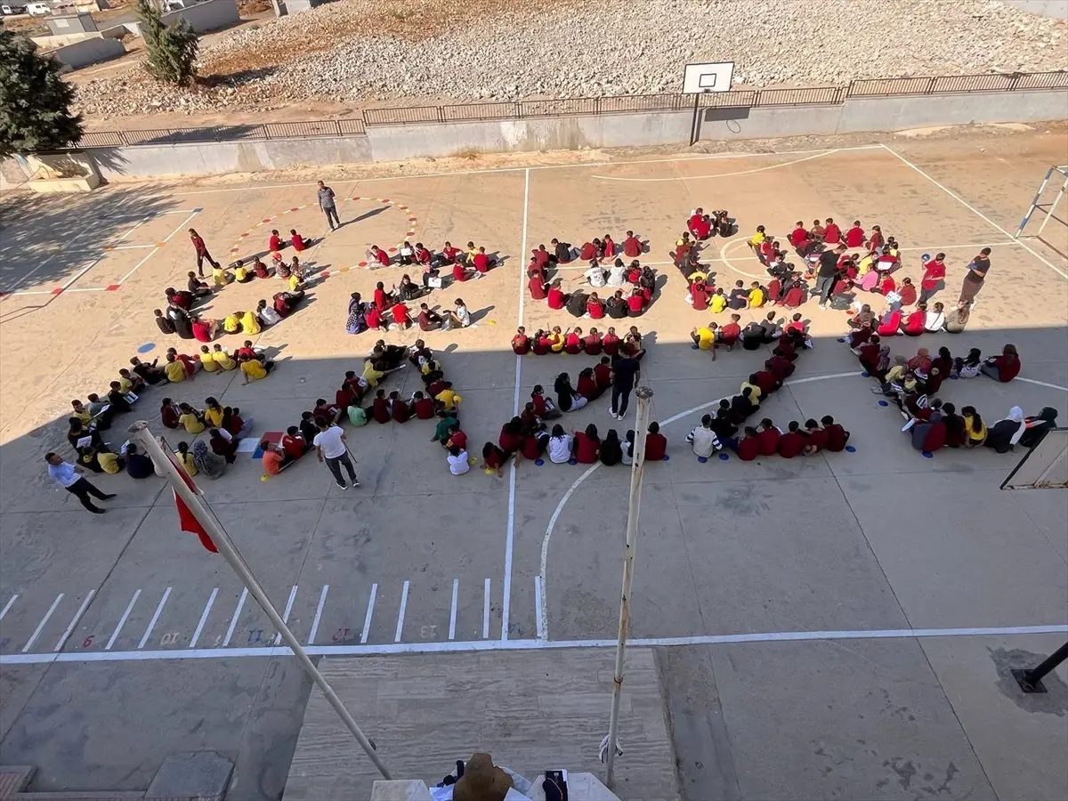 Etkinlik kapsamında okul bahçesinde bir araya gelen öğrenciler, özgürlük şarkıları eşliğinde “Özgür Gazze” yazılı koreografi oluşturdu.