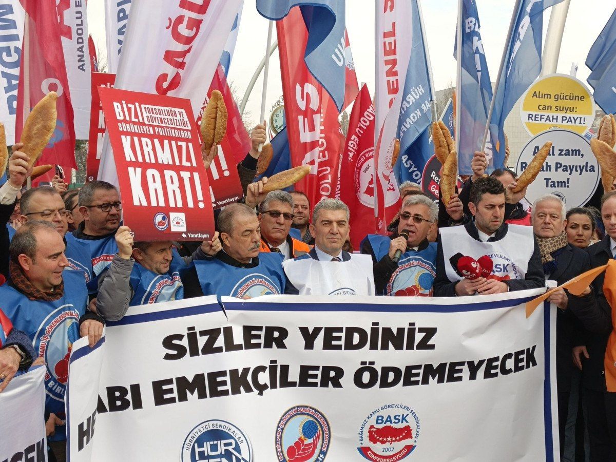 Gelirlerimizin artmaması, aldığımız maaşların yetmemesi nedeniyle refah payı talep ediyoruz. Sabit gelirlilerin kira, elektrik, doğal gaz, gıda ve diğer zorunlu harcamalarının artması sebebiyle kamu görevlileri olarak emeğimizin karşılığını almak için meydanlarda olmaya devam ediyoruz. Son bir yılda doğal gaz yüzde 60, elektrik ve akaryakıt yüzde 40, market-pazar enflasyonu ise en az yüzde 100 artmış durumda. Yılbaşından itibaren ekmeğe yüzde 25 zam geldi. Ev kiraları ise 30 bin-35 bin TL civarına yükseldi ve memurların bu kiraları karşılaması imkânsız hale geldi. Emeğimizin hakkını almak için refah payı şart diyoruz. Taleplerimizi yüksek sesle yineliyoruz.