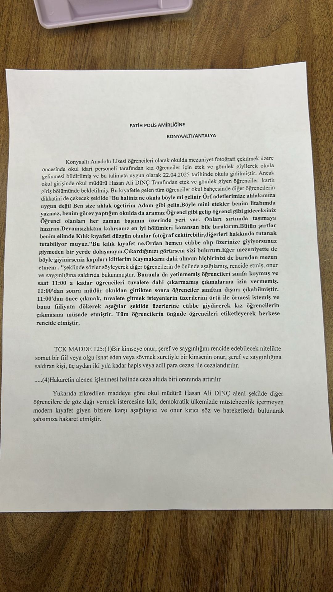 Antalya’da bulunan Konyaaltı Anadolu Lisesi’nde, geçtiğimiz hafta yaşanan olayda, okul idaresi tarafından kız öğrencilerin mezuniyet fotoğraf çekimleri için beyaz gömlek ve etek ile okula gelmeleri istendiği ancak okul müdürü Hasan Ali Dinç’in kız öğrencilerin eteklerini beğenmeyerek öğrencileri cübbe giymeye zorladığı ileri sürüldü.