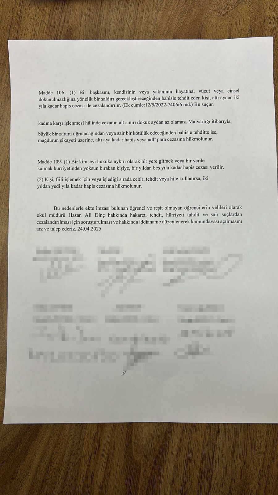 “Okul müdürü Hasan Ali Dinç’in fiilleri; TCK 125. madde ( hakaret), 106. madde (tehdit) ve 109. madde (hürriyeti tahdit) kapsamında suç teşkil etmektedir. Bu nedenle velilerimiz tarafından ilgili şahıs hakkında Cumhuriyet Başsavcılığı’na suç duyurusunda bulunulmuştur.”