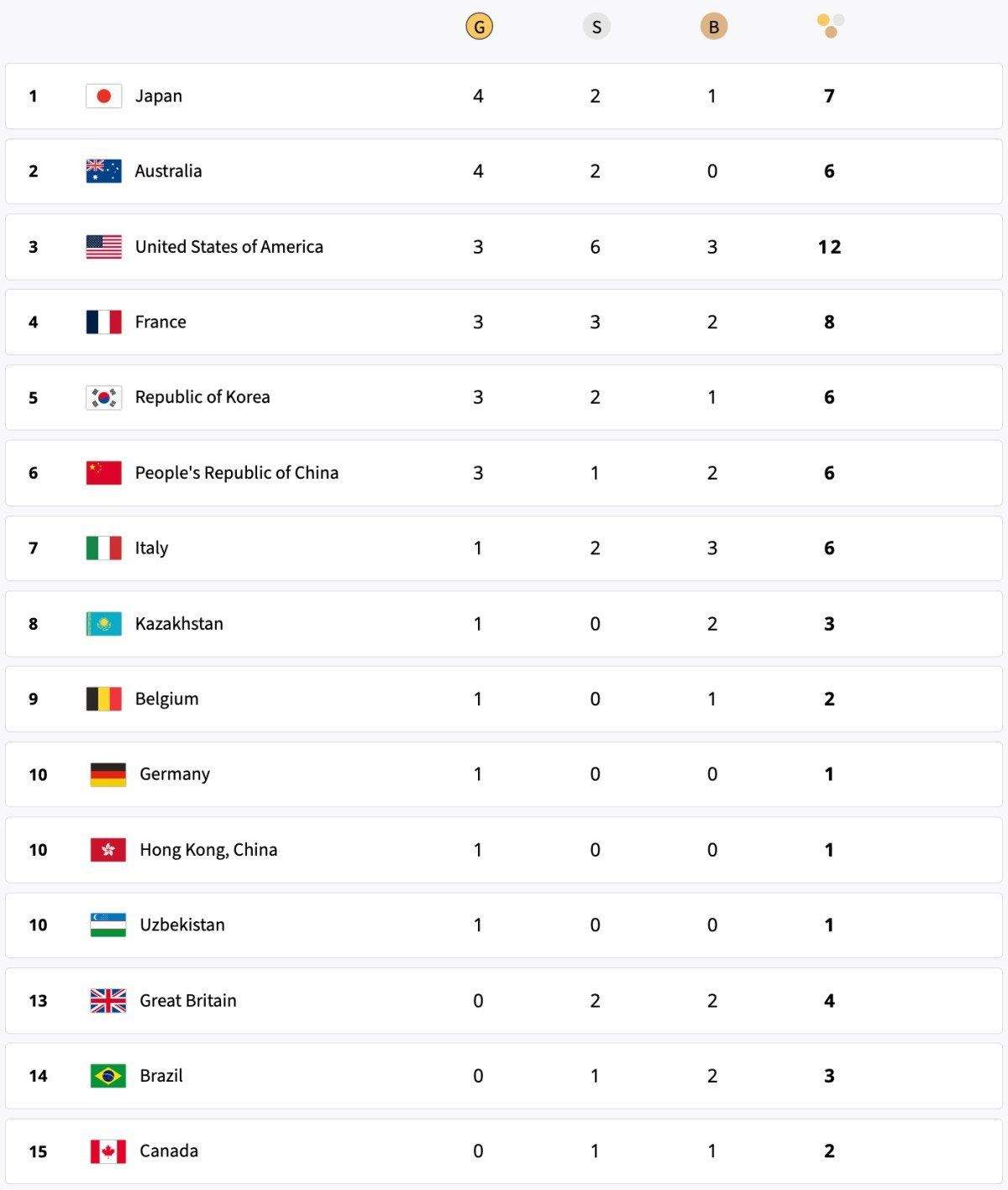 Eskrimde 1 altın, judoda 2 altın ve 1 bronz, kaykayda 1 altın ve 1 gümüş, yüzmede de 1 gümüş madalya kazanan Japonya, toplamda 4 altın, 2 gümüş ve 1 bronzla ülkeler sıralamasında en üst basamağa yükseldi.