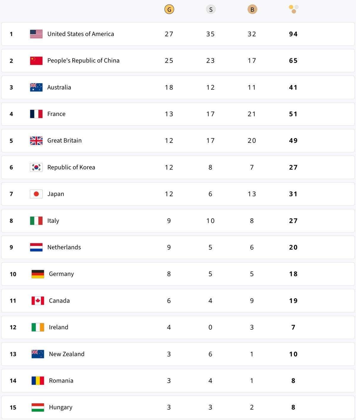 18 altın, 12 gümüş ve 11 bronzla Avustralya üçüncü, ev sahibi Fransa ise 13 altın, 17 gümüş, 21 bronzla dördüncü sırada.