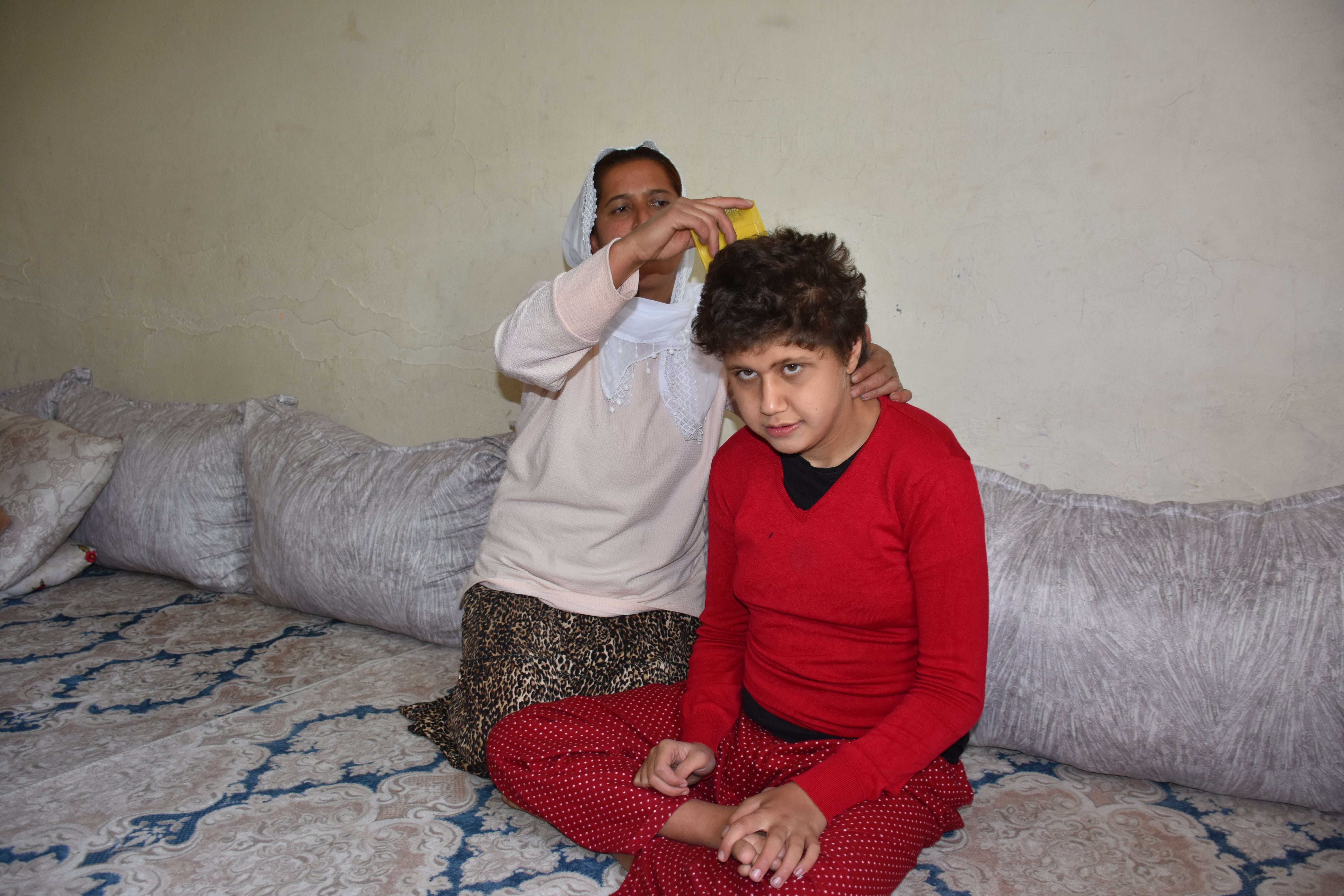Gündoğdu Mahallesi‘nde yaşayan Vesile Abay da zihinsel ve bedensel engelli 17 yaşındaki kızı Hicran ile epilepsi hastası 6 yaşındaki oğlu Mustafa‘nın tüm ihtiyaçlarını karşılamak için gece gündüz çabalıyor.