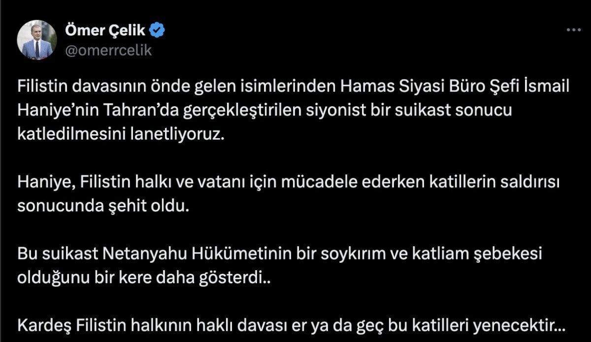 AK Parti Sözcüsü Ömer Çelik, Hamas lideri Heniyye'nin suikast sonucu hayatını kaybetmesiyle ilgili açıklamada bulundu.