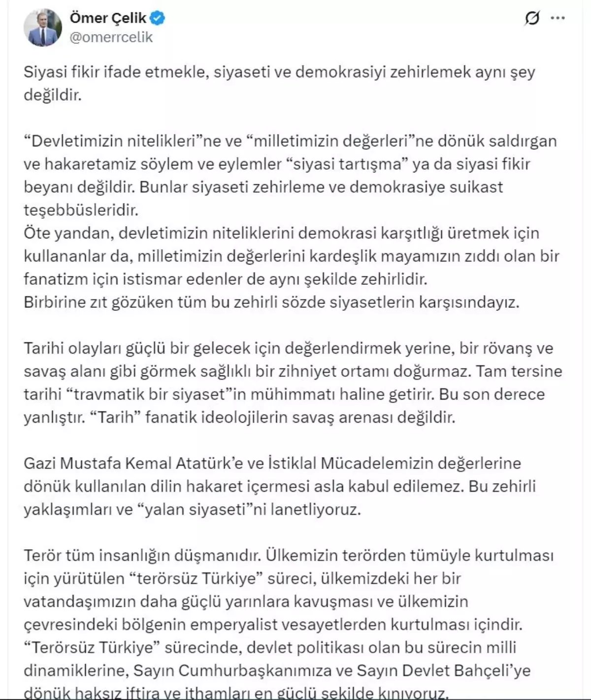 AK Parti Sözcüsü Ömer Çelik, sosyal medya hesabında yaptığı açıklamada, “Siyasi fikir ifade etmekle, siyaseti ve demokrasiyi zehirlemek aynı şey değildir. Devletimizin niteliklerine ve milletimizin değerlerine dönük saldırgan ve hakaretamiz söylem ve eylemler ‘siyasi tartışma’ ya da siyasi fikir beyanı değildir. Bunlar siyaseti zehirleme ve demokrasiye suikast teşebbüsleridir. Öte yandan, devletimizin niteliklerini demokrasi karşıtlığı üretmek için kullananlar da milletimizin değerlerini kardeşlik mayamızın zıddı olan bir fanatizm için istismar edenler de aynı şekilde zehirlidir. Birbirine zıt gözüken tüm bu zehirli sözde siyasetlerin karşısındayız. Tarihi olayları güçlü bir gelecek için değerlendirmek yerine, bir rövanş ve savaş alanı gibi görmek sağlıklı bir zihniyet ortamı doğurmaz. Tam tersine tarihi travmatik bir siyasetin mühimmatı haline getirir. Bu son derece yanlıştır. Tarih, fanatik ideolojilerin savaş arenası değildir. Gazi Mustafa Kemal Atatürk’e ve İstiklal Mücadelemizin değerlerine dönük kullanılan dilin hakaret içermesi asla kabul edilemez. Bu zehirli yaklaşımları ve yalan siyasetini lanetliyoruz” dedi.
