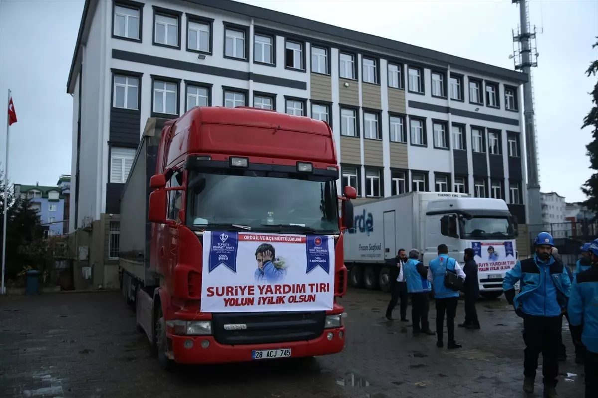 Ordu’da İl Müftülüğü ile Diyanet İşleri Başkanlığı Türk Diyanet Vakfı Ordu Şubesinin işbirliğiyle hazırlanan insani yardım malzemesi taşıyan 4 tır, Suriye’ye uğurlandı.