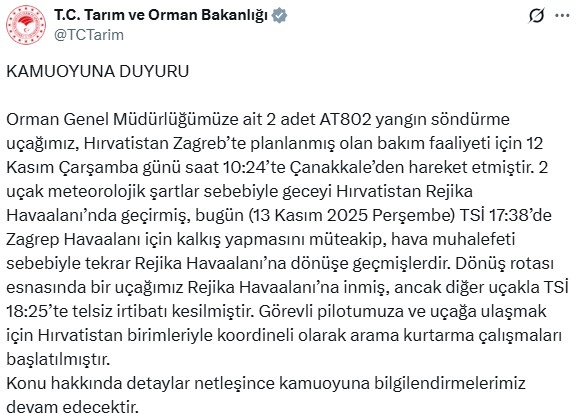 Tarım ve Orman Bakanlığı’ndan konuya ilişkin yapılan açıklamada şu ifadelere yer verildi:”Kamuoyuna Duyuru. Orman Genel Müdürlüğümüze ait 2 adet AT802 yangın söndürme uçağımız, Hırvatistan Zagreb’te planlanmış olan bakım faaliyeti için 12 Kasım Çarşamba günü saat 10:24’te Çanakkale’den hareket etmiştir. 2 uçak meteorolojik şartlar sebebiyle geceyi Hırvatistan Rejika Havaalanı’nda geçirmiş, bugün (13 Kasım 2025 Perşembe) TSİ 17:38’de Zagrep Havaalanı için kalkış yapmasını müteakip, hava muhalefeti sebebiyle tekrar Rejika Havaalanı’na dönüşe geçmişlerdir.