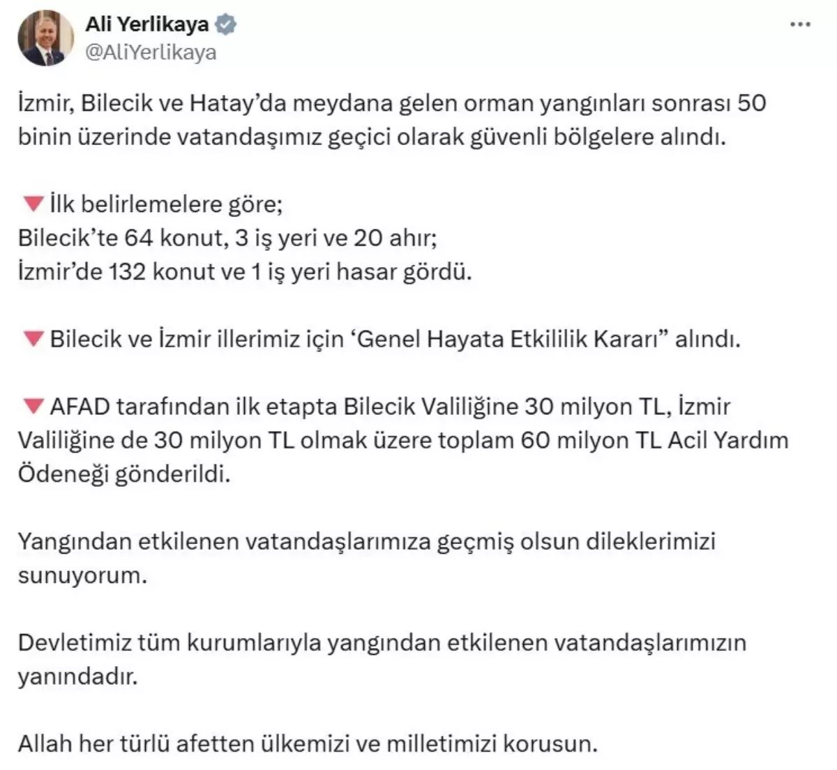 Bakan Yerlikaya, sosyal medya hesabından yaptığı açıklamada, “İzmir, Bilecik ve Hatay’da meydana gelen orman yangınları sonrası 50 binin üzerinde vatandaşımız geçici olarak güvenli bölgelere alındı. İlk belirlemelere göre; Bilecik’te 64 konut, 3 iş yeri ve 20 ahır; İzmir’de 132 konut ve 1 iş yeri hasar gördü. Bilecik ve İzmir illerimiz için ‘Genel Hayata Etkililik Kararı’ alındı. AFAD tarafından ilk etapta Bilecik Valiliğine 30 milyon TL, İzmir Valiliğine de 30 milyon TL olmak üzere toplam 60 milyon TL acil yardım ödeneği gönderildi. Yangından etkilenen vatandaşlarımıza geçmiş olsun dileklerimizi sunuyorum. Devletimiz tüm kurumlarıyla yangından etkilenen vatandaşlarımızın yanındadır. Allah her türlü afetten ülkemizi ve milletimizi korusun” dedi.