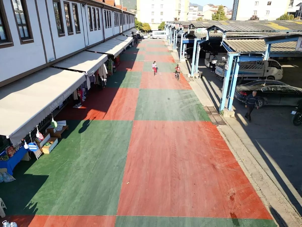 Osmaneli Belediyesi tarafından kapalı pazaryeri ve belediye binasının önünde yer alan alana kaydırmaz boya ile yol çalışması yapıldı.