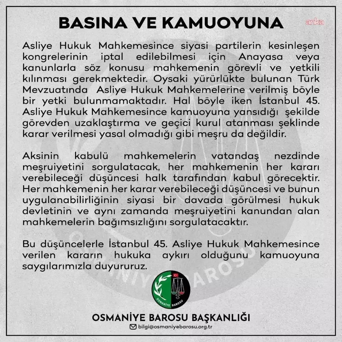 Osmaniye Barosu, İstanbul 45. Asliye Hukuk mahkemesince verilen Cumhuriyet Halk Partisinin (CHP) İstanbul İl yönetiminin görevden uzaklaştırılması kararının hukuka aykırı olduğunu, Asliye hukuk mahkemesince siyasi partilerin kesinleşen kongrelerinin iptal edilebilmesi için Anayasa veya kanunlarla söz konusu mahkemenin görevli ve yetkili kılınması gerekmektedir denildi. Osmaniye Barosu yaptığı yazılı açıklamada şu ifadelere yer verdi: