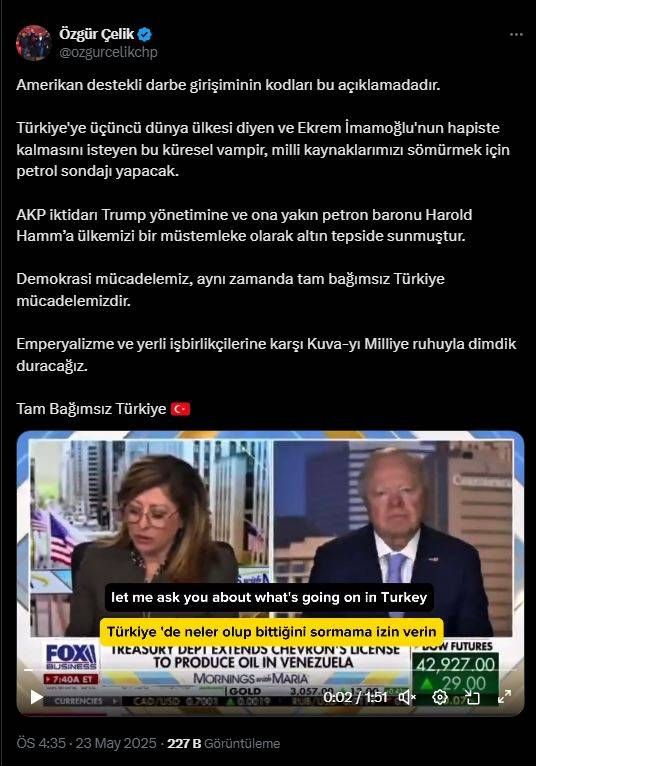 Cumhuriyet Halk Partisi (CHP) İstanbul İl Başkanı Özgür Çelik, ABD’nin petrol kralı Harold Hamm’in, Fox News’e verdiği röportajda Ekrem İmamoğlu hakkındaki açıklamalarına sert bir şekilde tepki gösterdi.