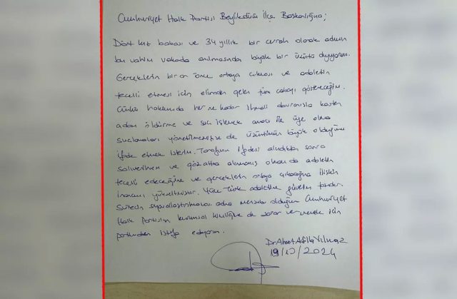 “Dört kız babası ve 34 yıllık bir hekim olarak adımın bu vahim vakada anılmasından büyük bir üzüntü duyuyorum. Gerçeklerin biran önce ortaya çıkması ve adaletin tecelli etmesi için elimden gelen tüm çabayı göstereceğimi bildiririm. Çünkü hakkımda her ne kadar ihmali davranışla kasten adam öldürme ve suç işlemek amacı ile üye olma suçlamaları yöneltilmemişse de üzüntümün büyük olduğunu ifade etmek isterim. Tarafımın ifadesi alındıktan sonra salıverilmem ve göz altına alınmamış olmam da adaletin tecelli edeceğine ve gerçeklerin ortaya çıkacağına ilişkin inancımı yükseltmiştir.Yüce Türk adaletine güvenim tamdır. Sürecin siyasallaştırılması adına, mensubu olduğum Cumhuriyet Halk Partisi’nin kurumsal kimliğine de zarar vermemek için partimden istifa ediyorum”
