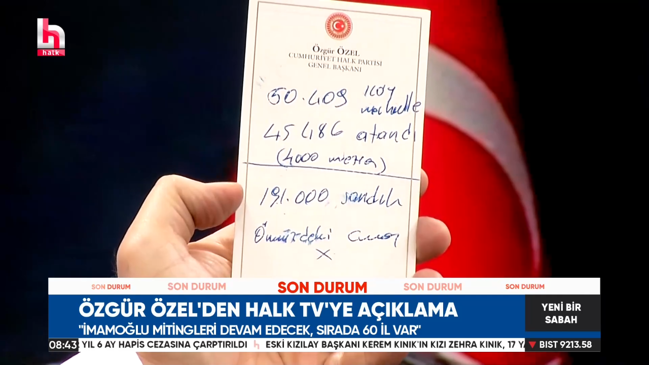 Dedi ki, “Cuma gününe kadar tamamlanacak.” Ve dedi ki, “Peki, “dedim bu İmamoğlu’nun tutuklamasıyla başlayan süreçteki eylemleriniz?” Devam edeceğim dedi. Çıkarttı bir başka yazıdan bana, 60 il şu anda “Sıra bizde, sıra bizde.” diyerek İmamoğlu ile ilgili gelişmeleri protesto etmek için eylem düzenliyor.
