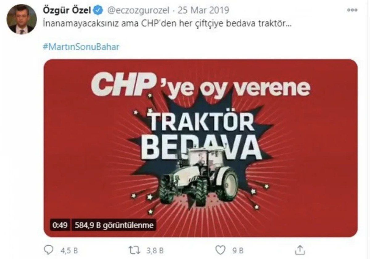 Özel’in bu vaadi akıllara 2019 yerel seçimleri öncesi CHP’nin bedava traktör vaadini getirdi.