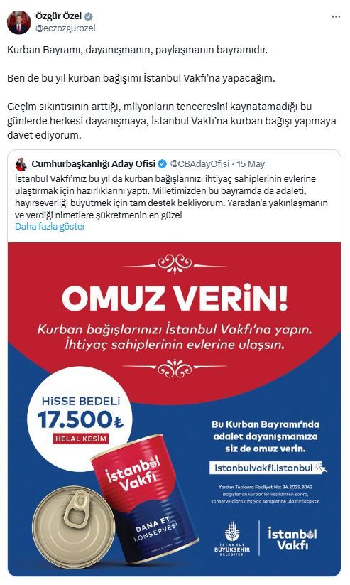 CHP Genel Başkanı Özgür Özel, İstanbul Vakfı’nın kurban bağışı çağrısına destek verdi.
