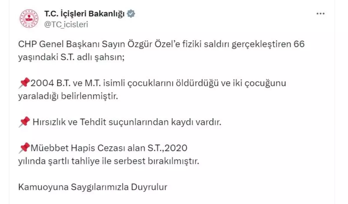 Bakanlığın sosyal medya hesabından yapılan açıklamada, “CHP Genel Başkanı Sayın Özgür Özel’e fiziki saldırı gerçekleştiren 66 yaşındaki S.T. adlı şahsın; 2004 B.T. ve M.T. isimli çocuklarını öldürdüğü ve iki çocuğunu yaraladığı belirlenmiştir. Hırsızlık ve tehdit suçlarından kaydı vardır. Müebbet hapis cezası alan S.T., 2020 yılında şartlı tahliye ile serbest bırakılmıştır” denildi.