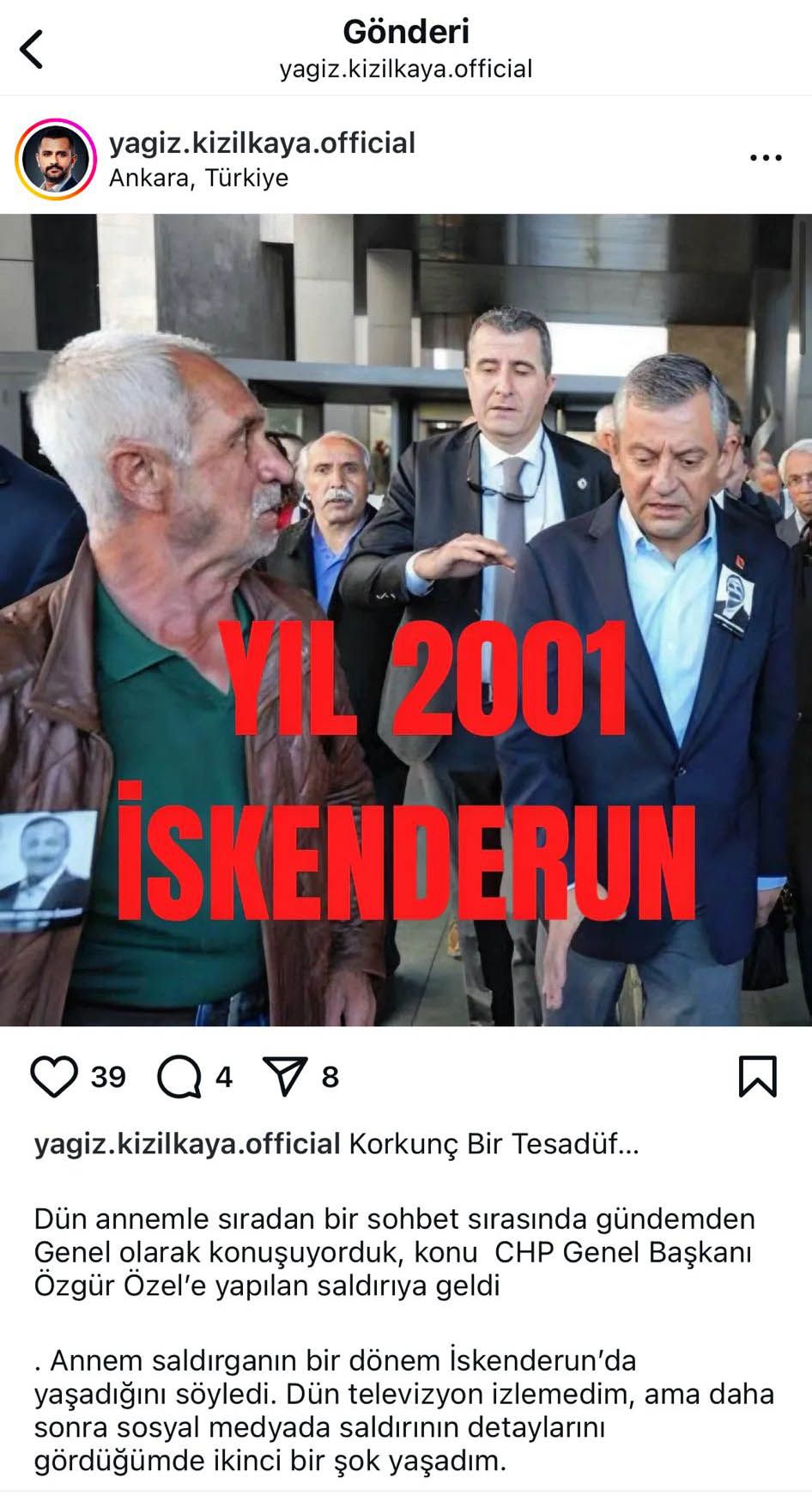 Ankara’da 2019’da TAMGA Uluslararası Arama ve Kurtarma Derneği’ni kuran Yağız Kızılkaya, 6 Şubat depremlerinde ekibiyle 340 kişiyi sağ kurtardı. Cumhurbaşkanlığı tarafından devlet üstün fedakarlık madalyası ve nişanı verilen Yağız Kızılkaya, Özgür Özel’e saldırıyı gerçekleştiren saldırganı ekranlarda ve sosyal medyada görünce, 14 yaşındayken boğazına bıçak dayayıp, cebindeki parayı gasbedenle aynı kişi olduğunu fark etti.