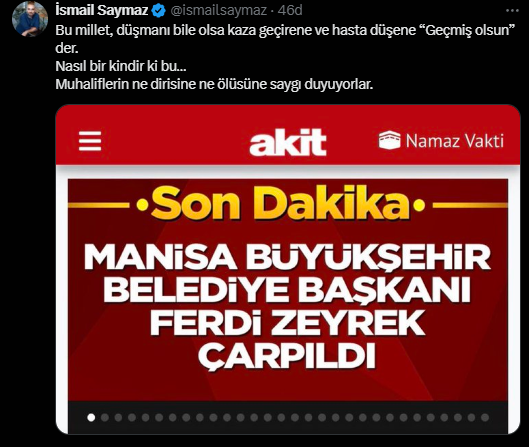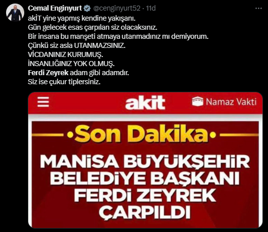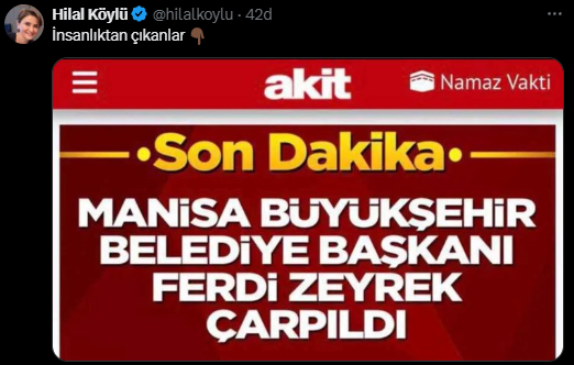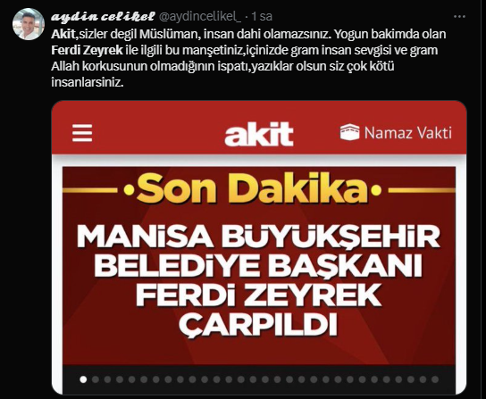 Yaşanan bu talihsiz olayın ardından sosyal medya ve haber mecralarında geniş yankı uyandı. Fakat bu üzücü olay karşısında sırf belediye başkanı CHP’li diye, sırf kendi görüşüne mensup olmadığı için paçavra Yeni Akit’in insanlık dışı bir ifade ile haberi paylaştığı görüldü. Paçavra yeni akit, Gazete, sosyal medya hesapları ve internet sitesinde “Manisa Büyükşehir Belediye Başkanı Ferdi Zeyrek çarpıldı” ifadelerini kullandı.