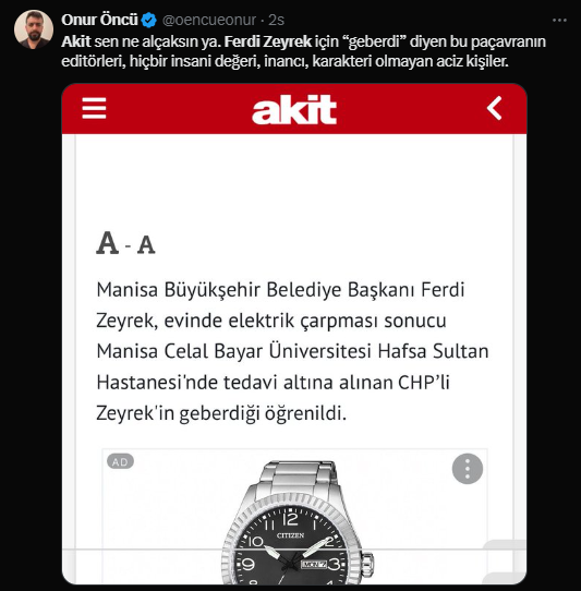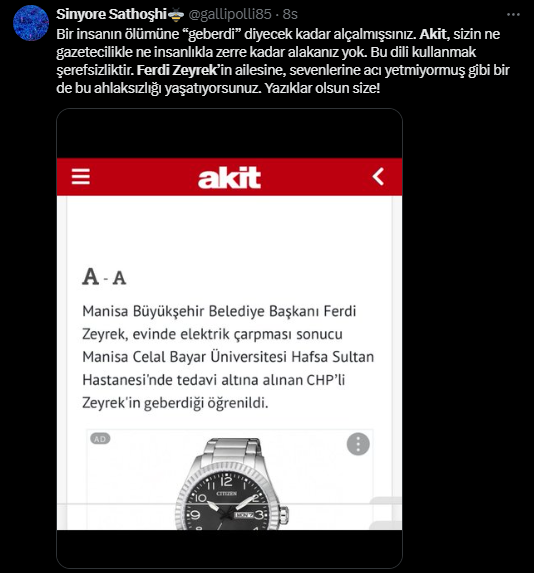 yeni akit’in girdiği haberde utanılması gereken başlığın yanından bir de hiç çekinmeden yaşam savaşı veren bir belediye başkanı için, “CHP’li Zeyrek’in geberdiği öğrenildi” şeklinde ifadelere yer verildiği görüldü.