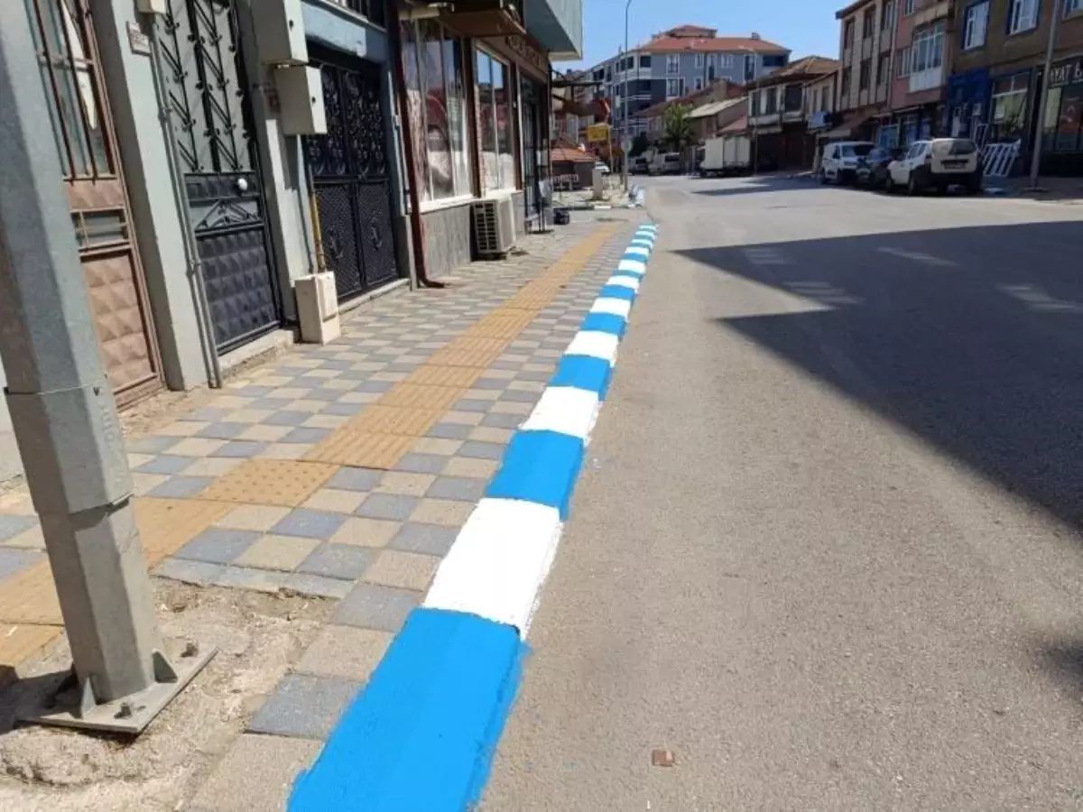 Bilecik’in Pazaryeri ilçesinde belediye ekipleri, ilçe merkezindeki ana caddelerde bulunan kaldırım taşlarını mavi ve beyaz renge boyadı.